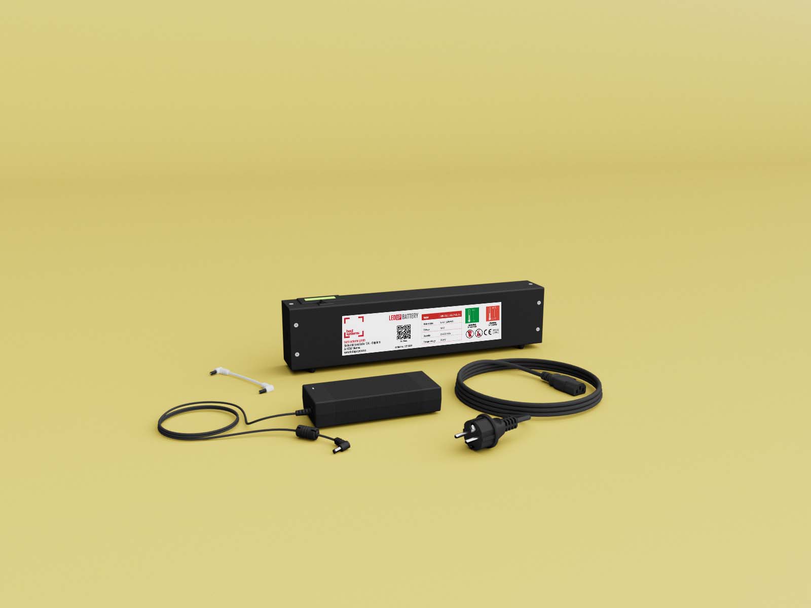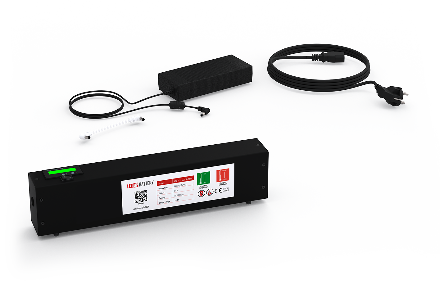 The rechargeable 24 volt lithium-ion battery has a weight of 2.8 kg with an output of 11,000mAh and can illuminate the Counter for approximately 9 hours. This gives you the opportunity to illuminate the Counter MAX, Counter ONE and LEDUP Counter for an entire day at a fair.