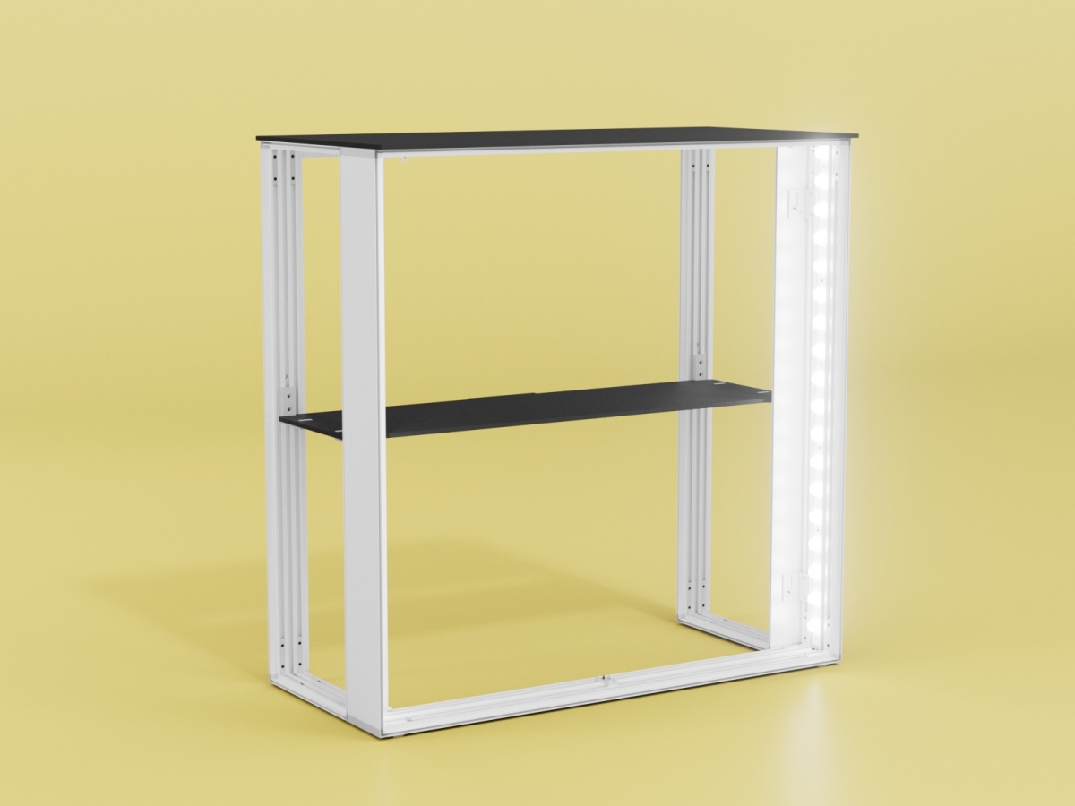 COUNTER ONE is made to last. Counter one is a mobile counter with an LED backlit front 100×100 cm / 39.4”x 39.4” and one storage shelf on the backside.