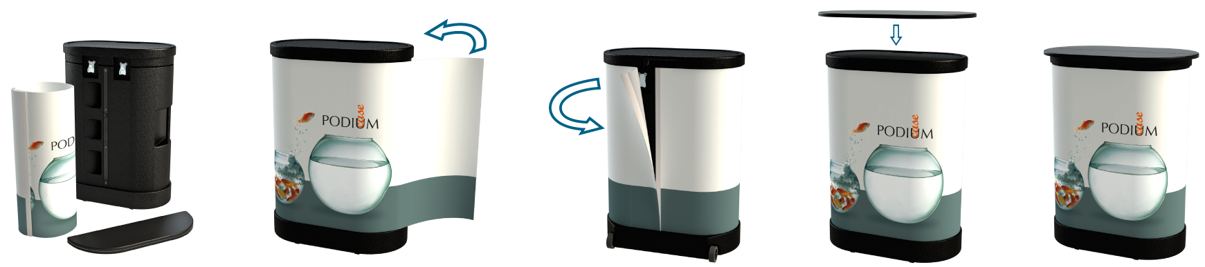 The wrap around graphic panel is secured with a full length Velcro strip, and the panel can be made from laminated PVC. With the addition of the optional foldable counter top, you have a large (76 x 48 cm / 29.9" x 18.9") work space to enhance your productivity at your next event or show.