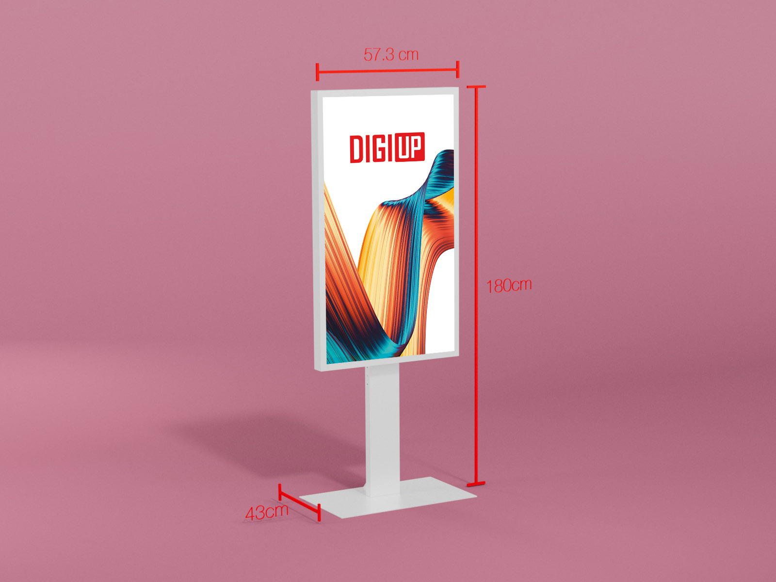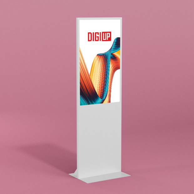 The display is suitable for both wall mounting and floor stand installation (stand is available as an accessory). Its slim wall mount allows the monitor to sit flush against the wall, giving it a picture-frame-like appearance, and is included in the scope of delivery. When used as a stand-mounted solution, the screen can be positioned at various heights and installed in either portrait or landscape orientation. The DIGIUP WINDOW is available in the standard colors black or white.