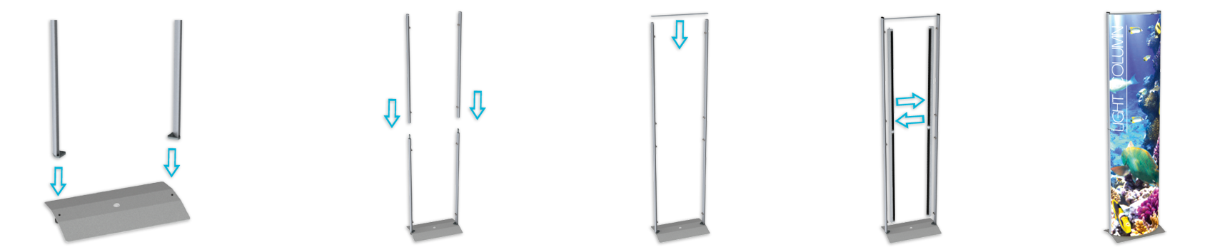 The portable light colum consists of a base, two 2-part poles, a top connection, four lamps and two graphic panels. No tools are required to set it up.