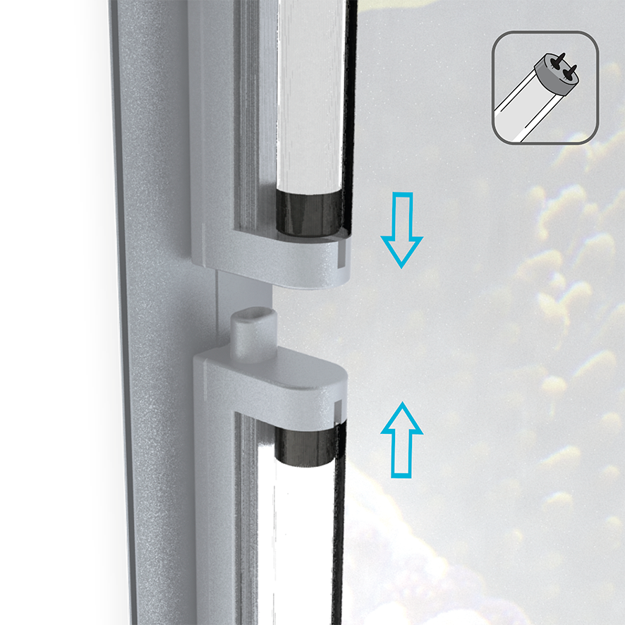 Four lamps, a cable and a plug are included in the delivery. Stick the lamps together and attach it at the side profiles. The lamps will now evenly illuminate both panels.