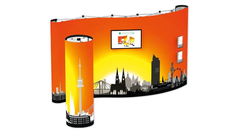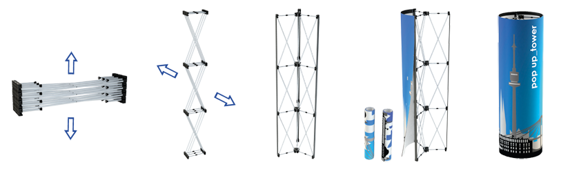 The foldable column pop up_tower is easy to set up. Unfold the system – magnetic locking, mount the magnetic bars and add the panels.